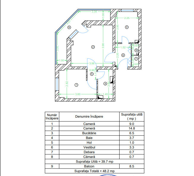 Dispune de o suprafata utila de 39,7 mp si o suprafata totala de 48,20 mp.