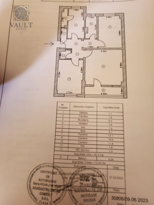 Alcatuit din:3 CAMERE,2 DORMITOARE,2 BAI(din care una cu geam),1 BALCON SI 2 DEBARALE