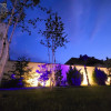 Curtea interioară a fost amenajată cu grijă pentru a crea o atmosferă de poveste. Gazonul impecabil, aleile pietruite și vegetația variată – de la pomi fructiferi la magnolii spectaculoase – contribuie la un peisaj care încântă privirile în orice anotimp. Primăvara, magnoliile înfloresc într-un spectacol de culori, iar vara, verdele intens al copacilor oferă o oază de răcoare.